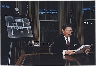 Reagan, l’acteur devenu président, lors d’un discours télévisé au sujet du projet guerre des étoiles, en 1983.